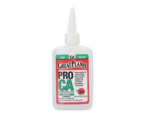 The Great Planes Pro CA Glue Thin 2 oz is a reliable adhesive for all my crafting needs. It works well on both porous and non-porous materials, and the thin formula ensures smooth application. I appreciate how quickly it sets, which saves me a lot of time during projects. The bottle design is also user-friendly, preventing any spills or waste. A solid choice for anyone in need of a high-quality CA glue.