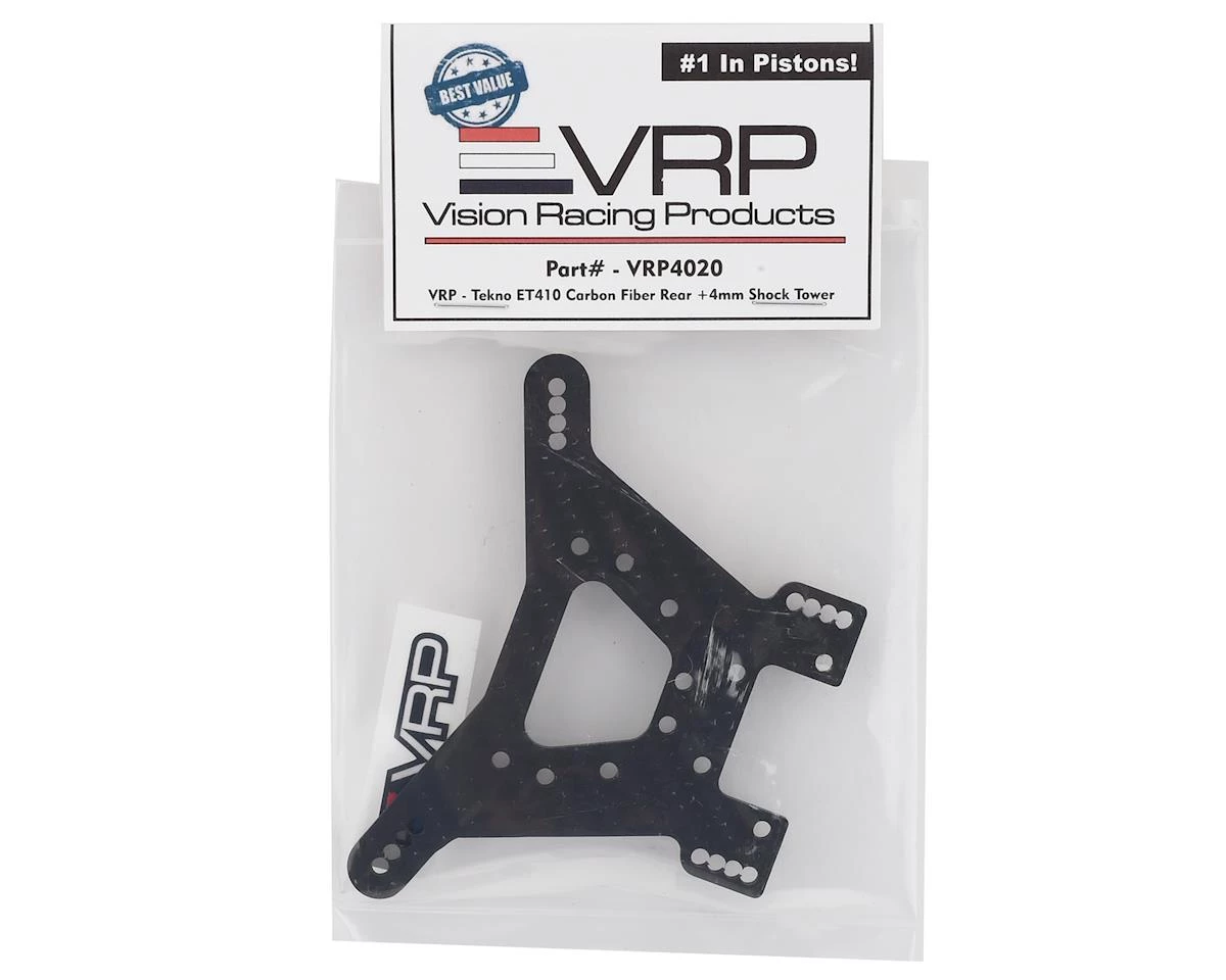 The VRP ET410 +4mm Carbon Fiber Rear Tower is a CNC machined option tower that increases the height of the upper shock mount positions by 4mm. During testing, this tower was found to excel on high bite conditions such as astroturf and carpet. Â