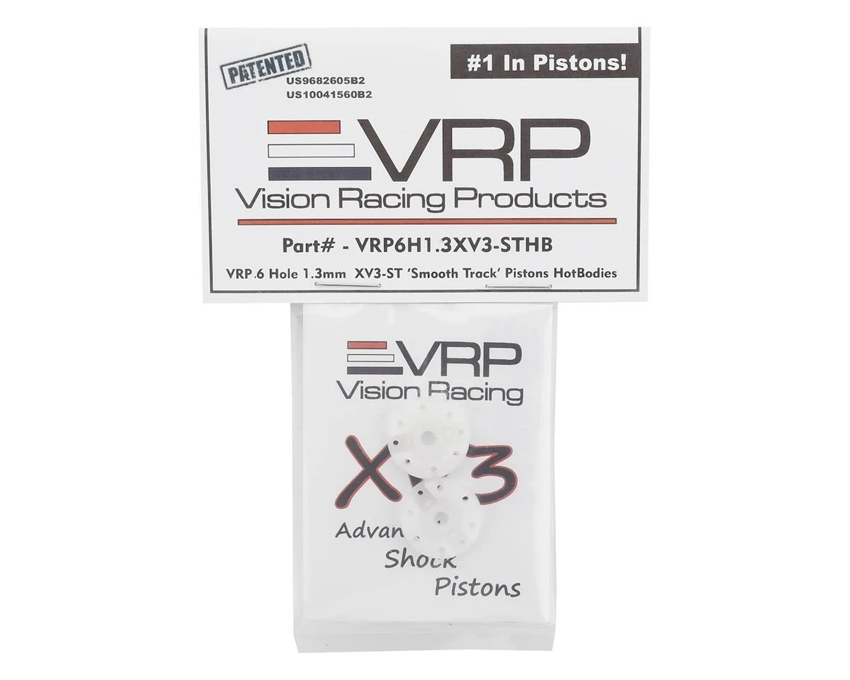 This is a VRP set of 6 Hole, 1.3mm flat XV3-ST ‘Smooth Track’ Pistons intended for use with 1/8 Hot Bodies Kits. The pistons come with the Transition Valves (not installed). The Rebound booster hole has been precision drilled to the exact size testing found to be the best ‘all around’ setting. This yields excellent results that are proven on a variety of track surfaces. The ‘XV3’ has less material removed from around the center which equals a much more solid piston.