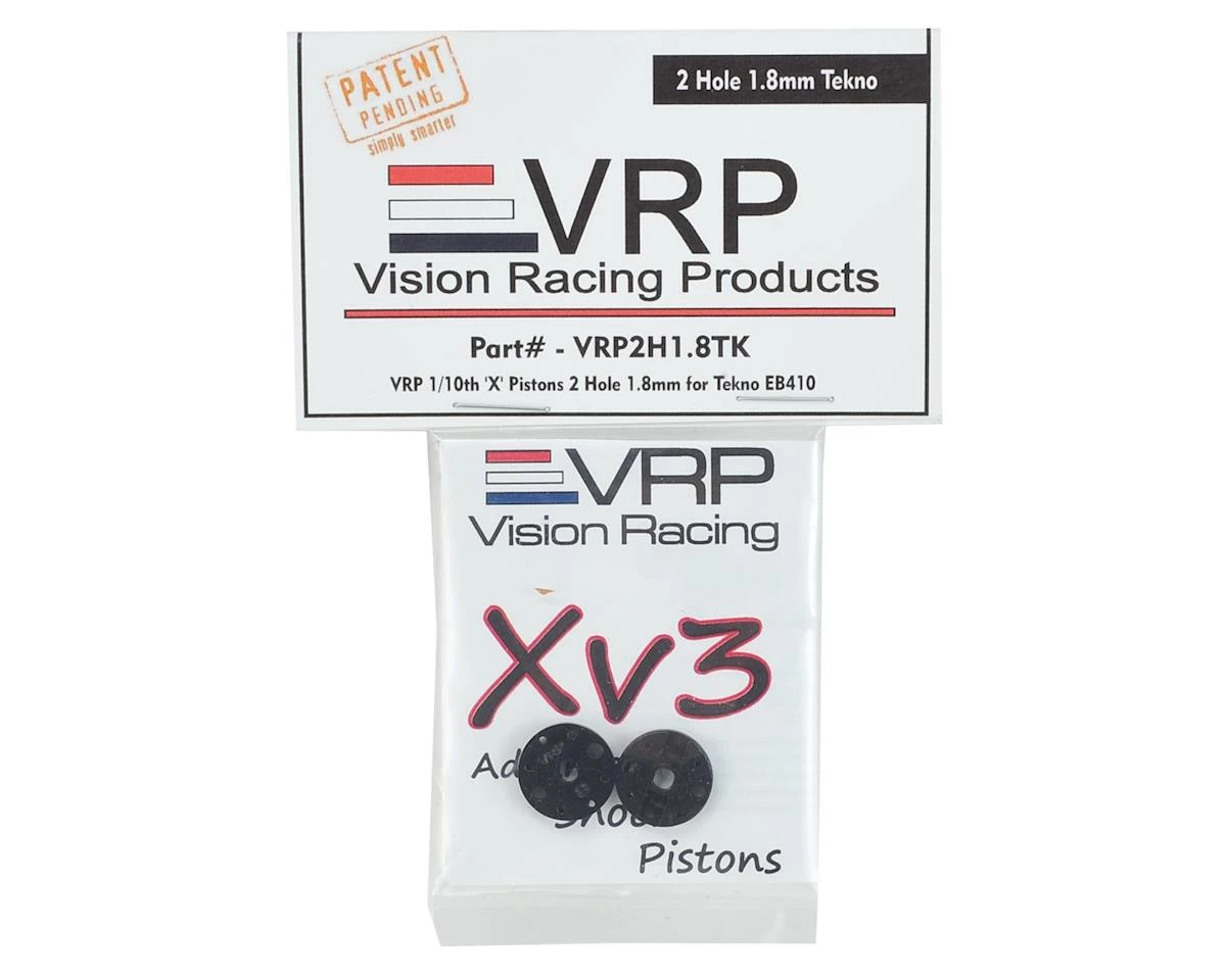 VRP Tekno EB410 “X V3” Shock Pistons feature the same slim sidewall design that reduces friction, yet maintains pack just like the 1/8 XV3 Pistons. Package includes two pistons, two rubber valves and two delrin washers.